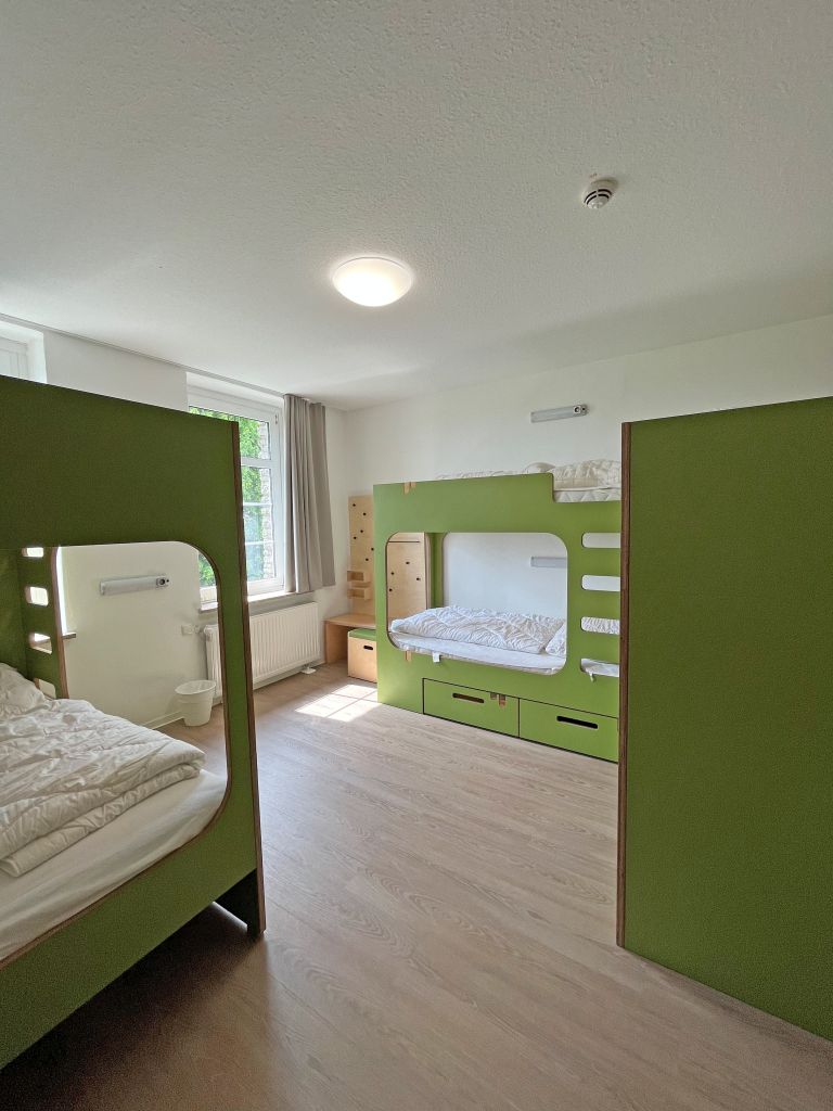 Stabile Doppelstockbetten in frischem Grün bieten in den Schlafzimmern Platz und Komfort für erholsame Nächte. Dabei gibt es bei den Mehrbettzimmern Zwei- bis Achtbettzimmer.